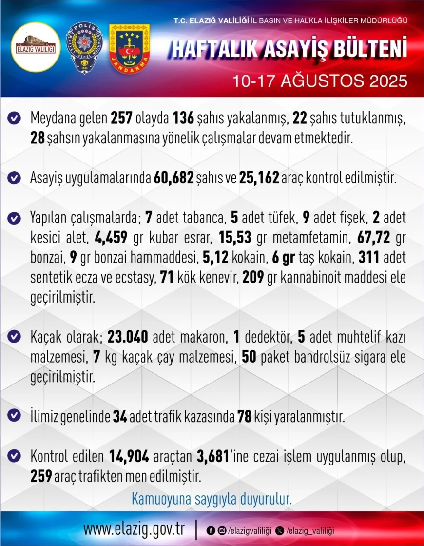 Elazığ Valiliği İl Basın ve Halkla İlişkiler Müdürlüğü, 10-17 Ağustos 2025 tarihlerini kapsayan haftalık asayiş bültenini yayımladı.