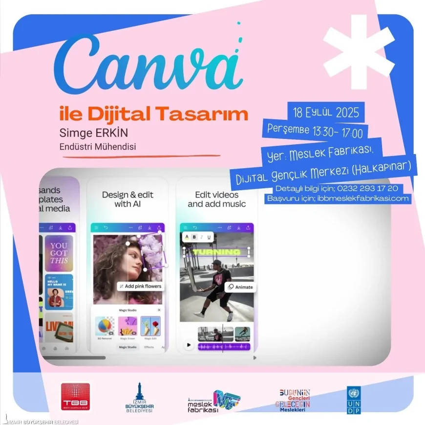 İzmir Büyükşehir Belediyesi Kadın ve Aile Hizmetleri Dairesi Başkanlığı bünyesindeki Meslek Fabrikası, gençlerin dijital becerilerini geliştirmeleri için yeni bir eğitim programı başlatıyor. Dijital Gençlik Merkezi’nde 18 Eylül Perşembe günü saat 13.30-17.00 arasında düzenlenecek “Canva ile Dijital Tasarım” eğitimi, 16-30 yaş arası gençlerin katılımına açık olacak.